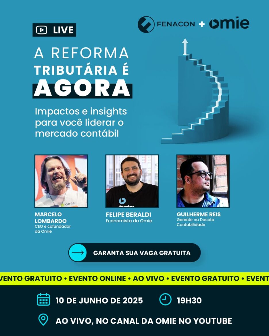 Em parceria com a FENACON, a Omie vai realizar a live “A Reforma Tributária é AGORA: Impactos e insights para você liderar o mercado contábil” no dia 10 de junho, às 19h30 de forma gratuita.