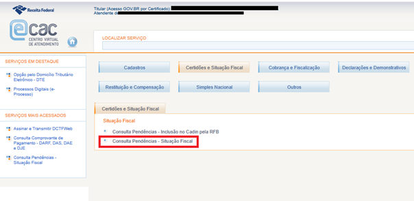 Passo 3. Na próxima tela, selecionar a opção “Consulta Pendências – Situação Fiscal”.